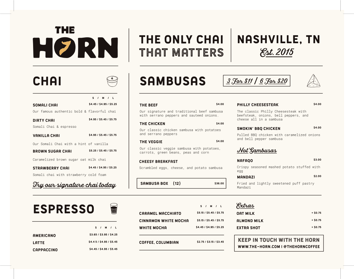 Welcome to The Horn - HQ, a vibrant culinary spot nestled at 619 Murfreesboro Pike in Nashville. This bustling eatery is renowned for its delightful selection of sambusas, each lovingly crafted to celebrate rich flavors. Signature offerings include the classic Beef and Chicken Sambusas, both infused with serrano peppers and sautéed onions, each priced at just $3.50. For a unique twist, try the Philly Cheese Steak sambusa at $4.00, or the delightful Cheesy Breakfast variant, perfect for starting your day.